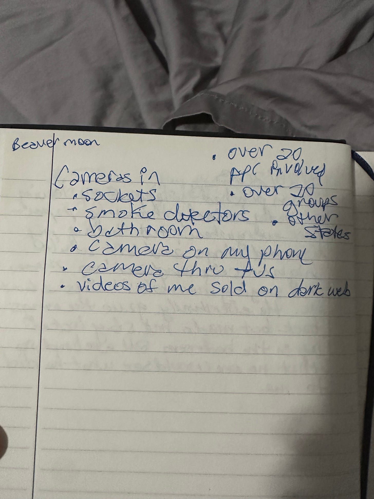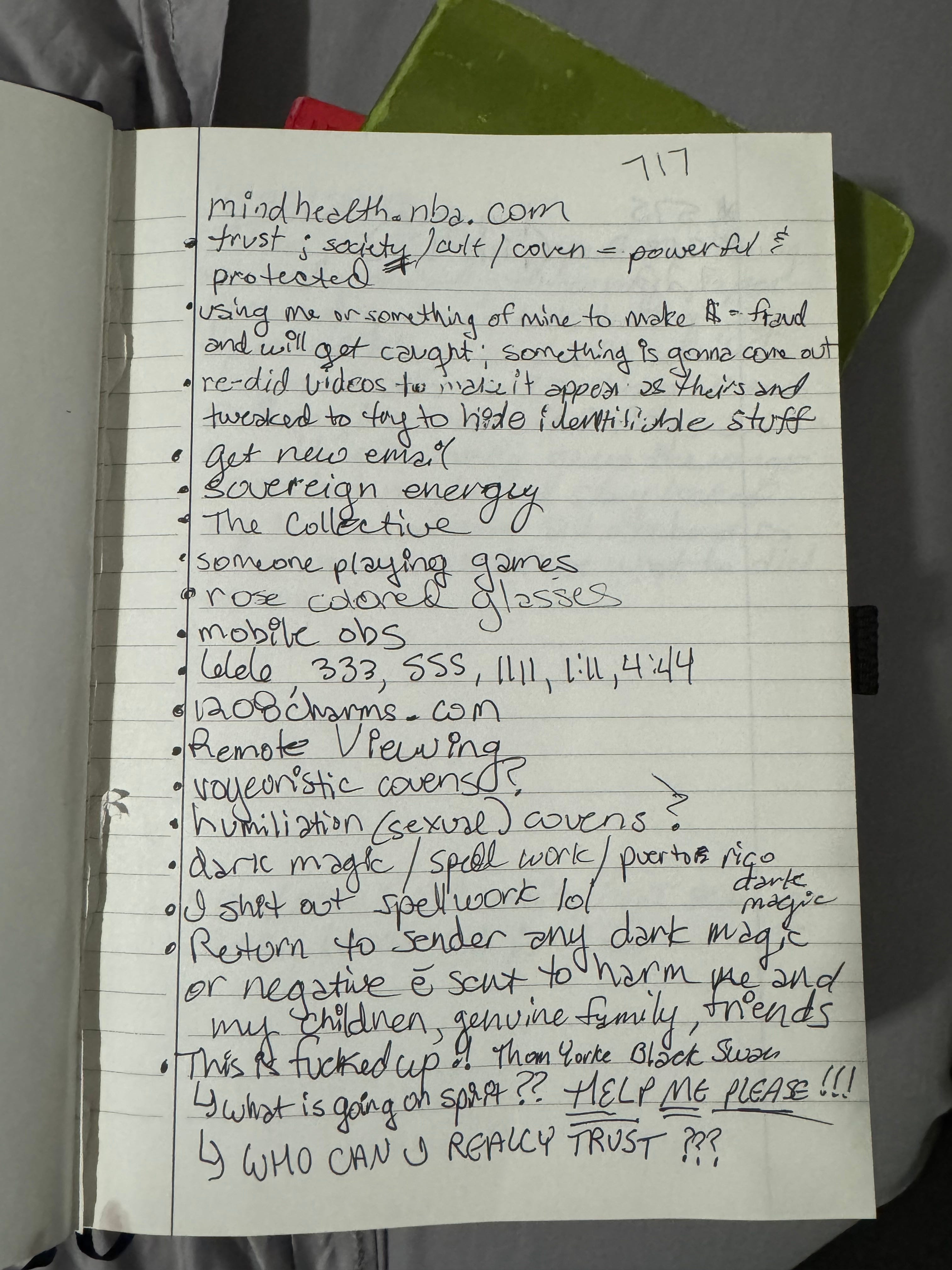 Her delusions included the following below. She would deny that she ever made these claims, but she said these delusions in front of our friends and family. I also would record her on my phone when she was having a mental health episode, and she has made these delusional claims while I openly recorded her. And then I found her handwritten notes scattered around the house making many these same delusional claims.